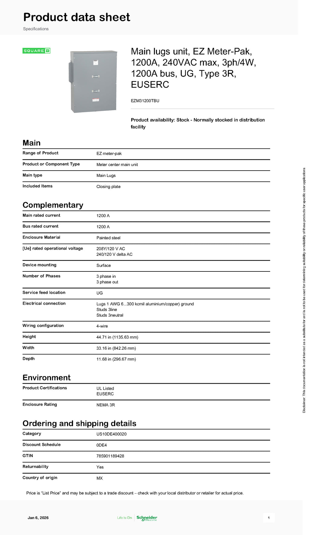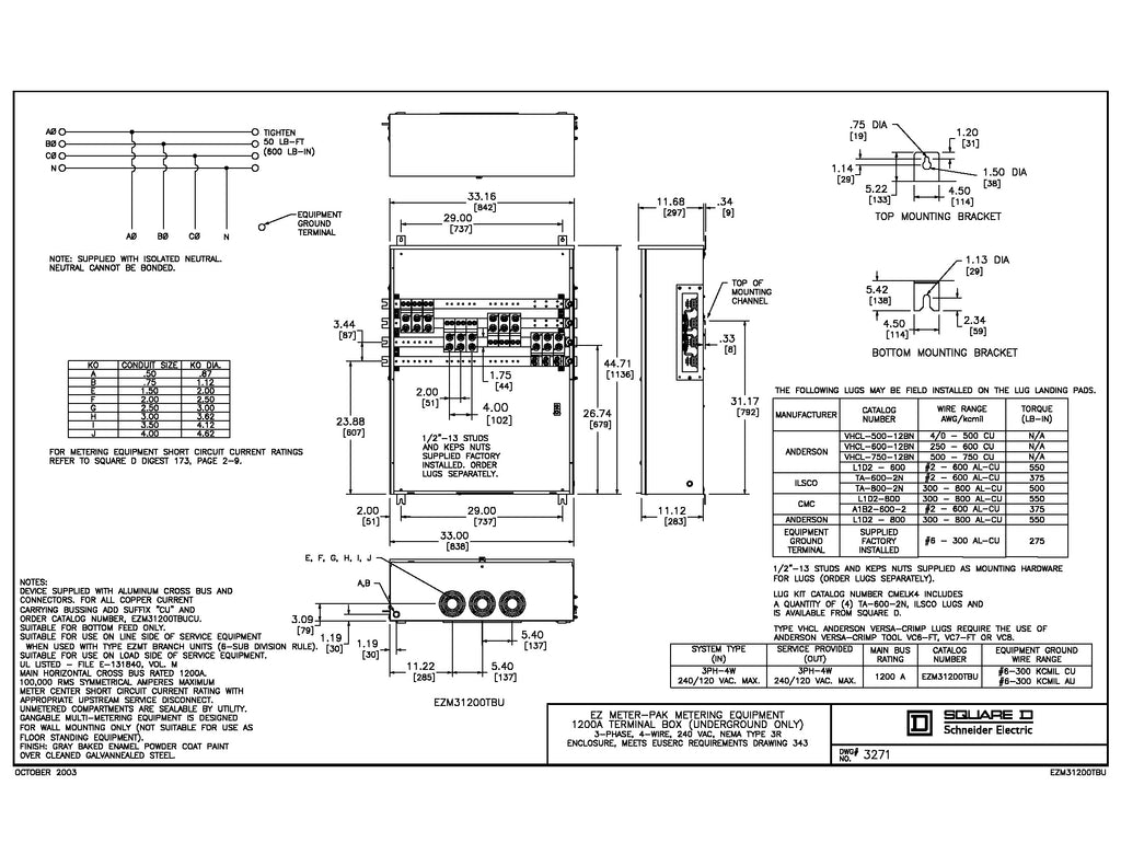 Square D EZM31200TBU 3PH 1200A EUSERC Rated Main Tap Box